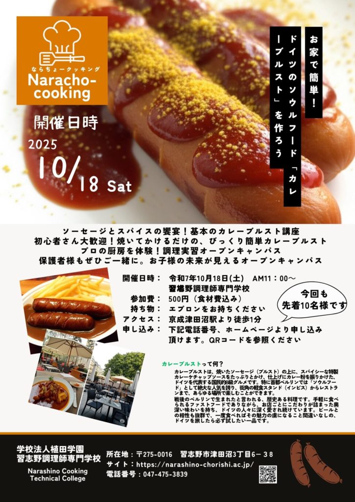 2025.09.19お知らせ 入学体験 令和7年10月18日 (土) ならちょークッキング開催決定 先着 10名様限定! 調理初心者、学生、一般人大歓迎です。 今回も、調理師専門学校の実習室で”カレーブルスト”を調理し、試食会を開催します。 日時 令和7年10月18日(土曜日)午前11時 ~ 参加費は、1組500円です。 みなさんの参加をお待ちしております。 参加希望者は、下記のリンク先の申込フォームよりお申し込みください。 お申し込みは、こちらへ! NEWS 一覧