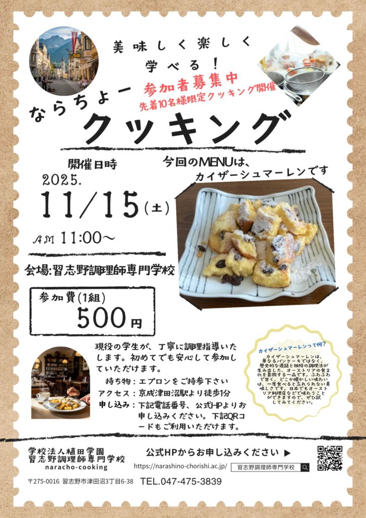 入学体験 令和7年11月15日(土)ならちょークッキング開催決定
