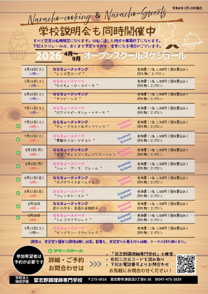 2026 ならちょークッキング&スイーツ年間スケジュール