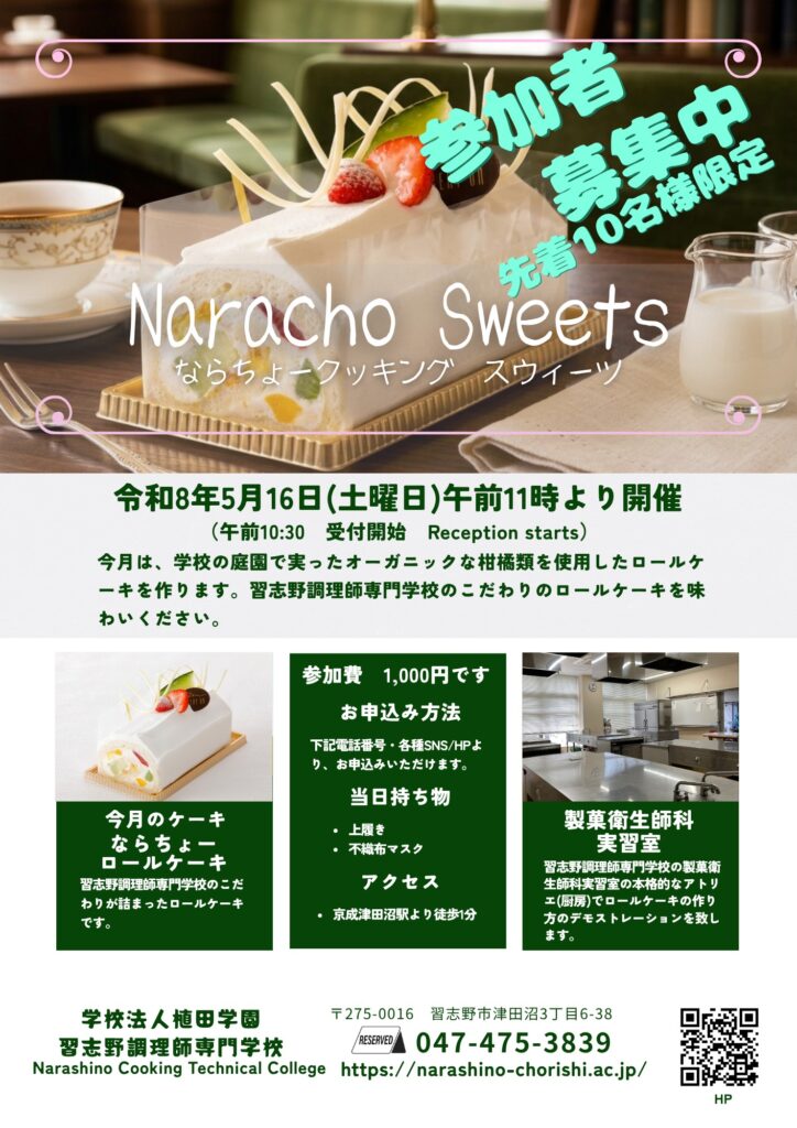 2026.04.06お知らせ 体験入学 2026年5月16日(土)ならちょースイーツ開催決定 本日より体験入学、5月16日開催のならちょースイーツの参加者を募集いたします。進路に悩んでるなら、体験入学が一番!軽い気持ちで参加してみましょう 今回も先着10名様限定!料理初心者、学生、一般人、大歓迎です。パティシエのデモストレーションとそのケーキの試食をして頂きます。 開催日時 令和8年5月16日(土曜日)午前11時~ 皆さんのご参加お待ちしております。申し込みは、こちらから→✉ NEWS 一覧